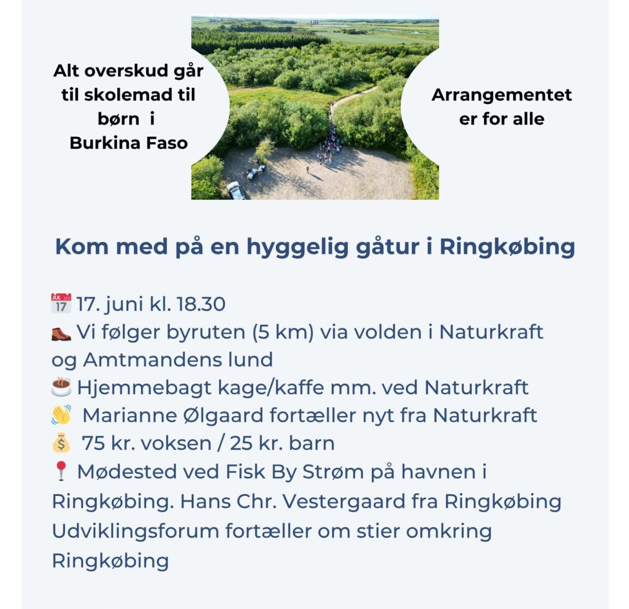 Soroptimisterne i Ringkøbing har igen i 2026 arrangeret en gåtur, hvor alt overskud går til skolemad til børn i Burkina Faso. Vi er en del af projektet Moving the World to end hunger.