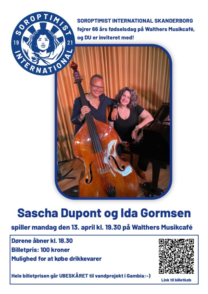 Soroptimist-klubben i Skanderborg fylder 66 år, og det har vi tænkt os at fejre med en skøn koncert i Walthers Musikcafé med Sascha Dupont og Ida Gormsen.