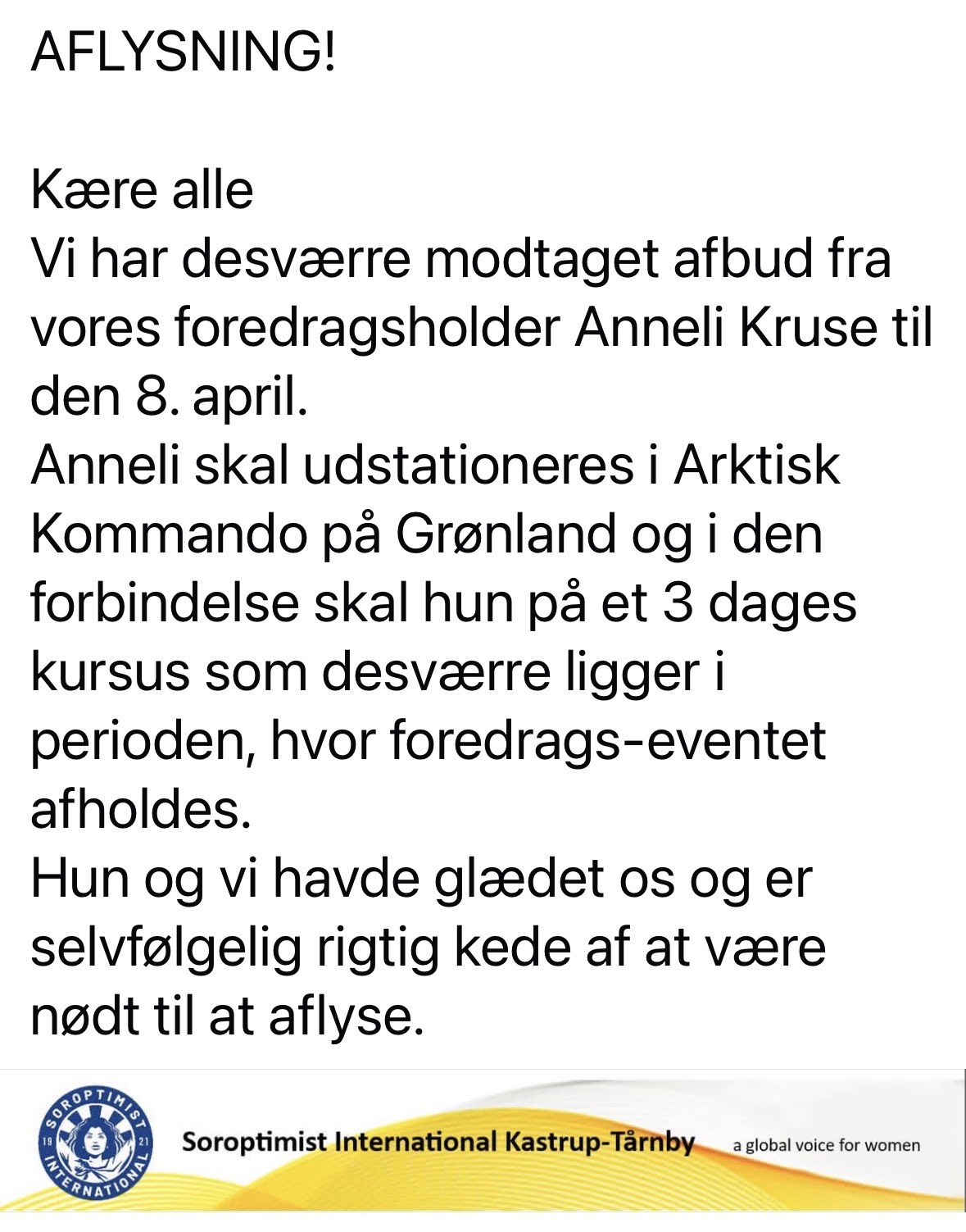 Aflysning Kære alle Vi har desværre modtaget afbud fra vores foredragsholder Anneli Kruse til den 8. april. Anneli skal udstationeres i Arktisk Kommando på Grønland og i den forbindelse skal hun på et 3 dages kursus som desværre ligger i perioden, hvor foredrags-eventet afholdes. Hun og vi havde glædet os og er selvfølgelig rigtig kede […]