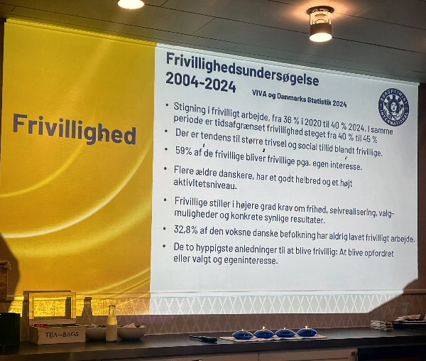 Eva fortalte bl.a. om frivilligt arbejde generelt. I Danmark viser der sig en stigning i antallet af frivillige hjælpere, måske fordi vi lever længere og er mere aktive. Undersøgelser viser også at ens levetid forlænges med 5 år, hvis man laver frivilligt arbejde. Det handler om trivsel, motivation, glæde og tillid. Der findes dog stadig en stor gruppe, som kan motiveres til frivilligt arbejde.