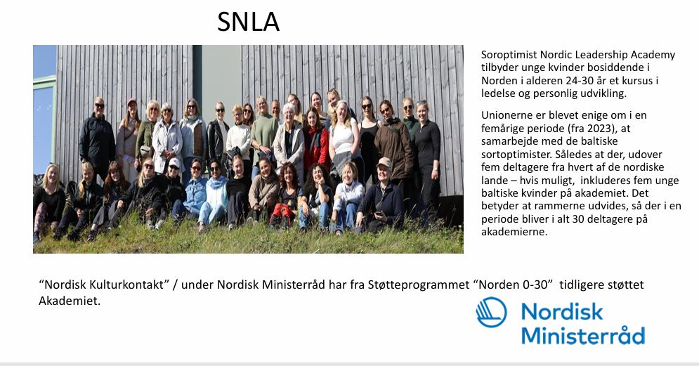 Soroptimist Nordic Leadership Academy er et årligt ugekursus, som tilbydes unge nordiske kvinder mellem 24 og 30 år. Det er et intensivt kursus i ledelse og personlig udvikling, og i 2026 afholdes det i Aarhus i juni måned.