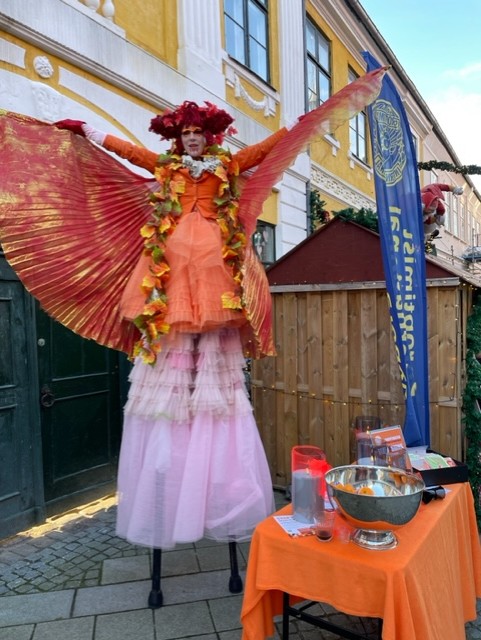 Foto fra klubmøde febr. 2026 – en spændende aften, hvor StylteSigne fortalte om sit liv og sit virke på stylter – samt fra besøg af StylteSigne 2025, 2024 og 2023 – StylteSigne i fuld vigør…..ifm SI Nyborgs Orange Dage.